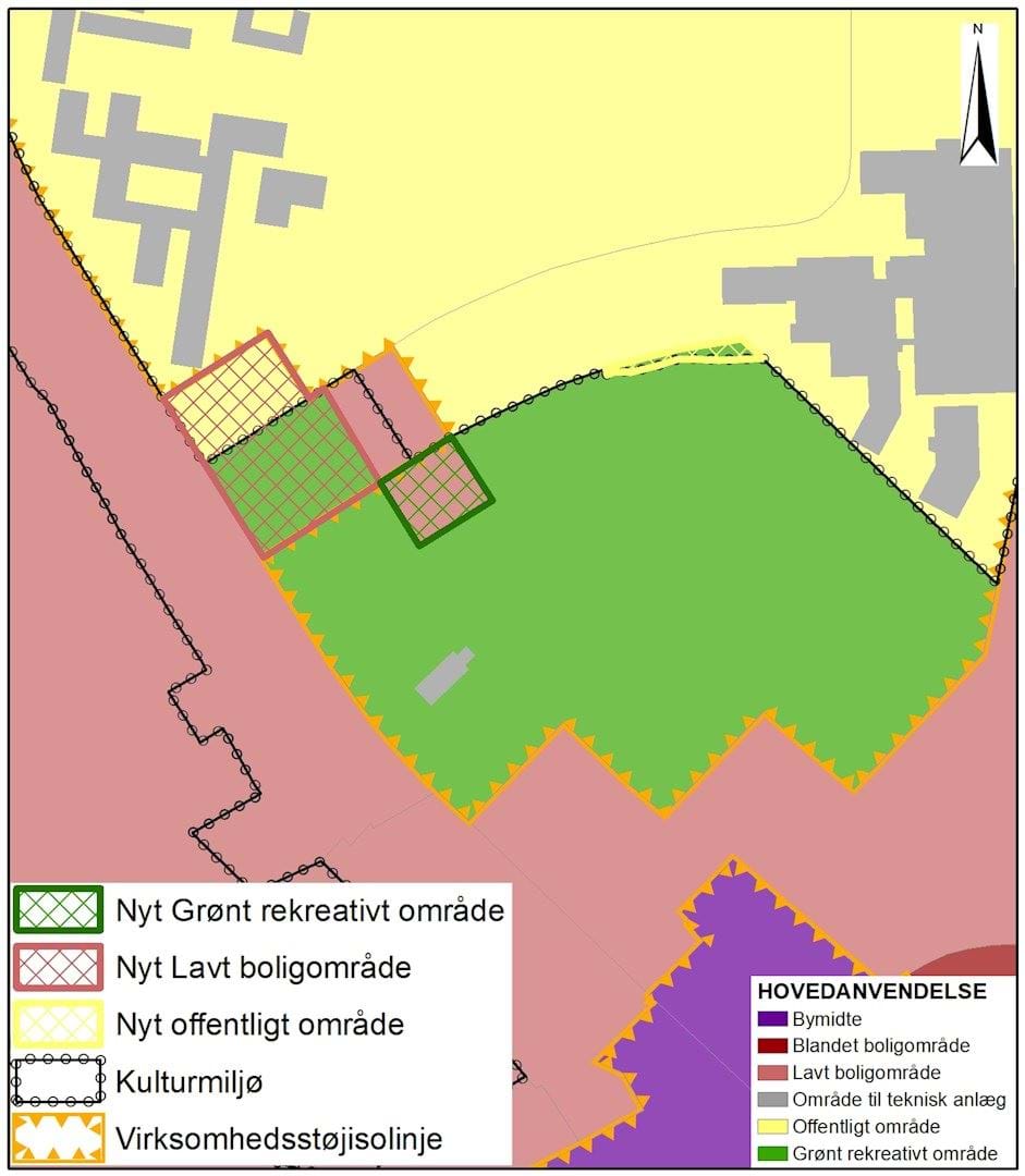 På kommuneplanens farvede hovedstrukturkort ændres en lille del af et Grønt rekreativt område til Offentligt område, et Offentligt område og Grønt rekreativt område ændres til Lavt boligområde. En del af et Lavt boligområde ændres til Grønt rekreativt område. Virksomhedsstøjisolinjen og Kulturmiljøafgrænsning ændres også. Ændringerne er illustreret på kortet.