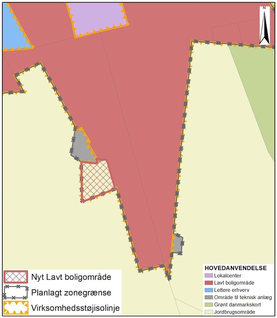 På kommuneplanens farvede hovedstrukturkort ændres en del af et Jordbrugsområde og Teknisk anlæg til Lavt boligområde. I den forbindelse ændres også Planlagt zonegrænse og Virksomhedsstøjisolinjen. Ændringerne er illustreret på kortet.