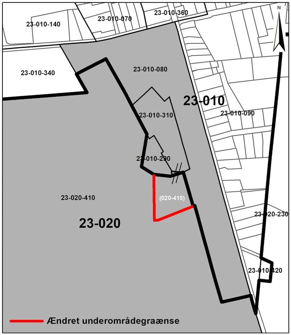 Af kortet kan ses at en del af enkeltområde 23-020-410 samt en meget lille del af enkeltområde 23-010-290 udskilles og sammenlægges med enkeltområde 23-010-310. Underområdet reguleres hermed.