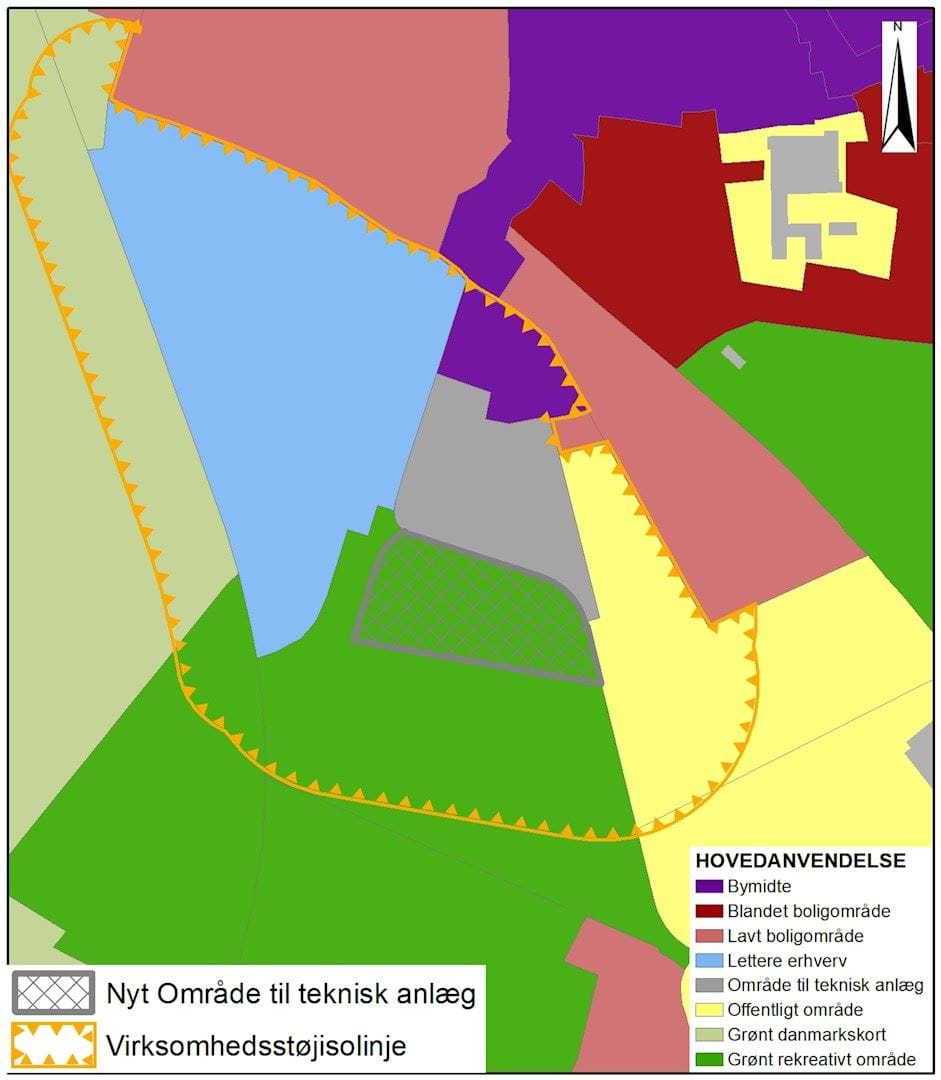 På kommuneplanens farvede hovedstrukturkort ændres en del af et Grønt rekreativt område til Teknisk anlæg, derved ændres Virksomhedsstøjisolinjen. Ændringerne er illustreret på kortet.