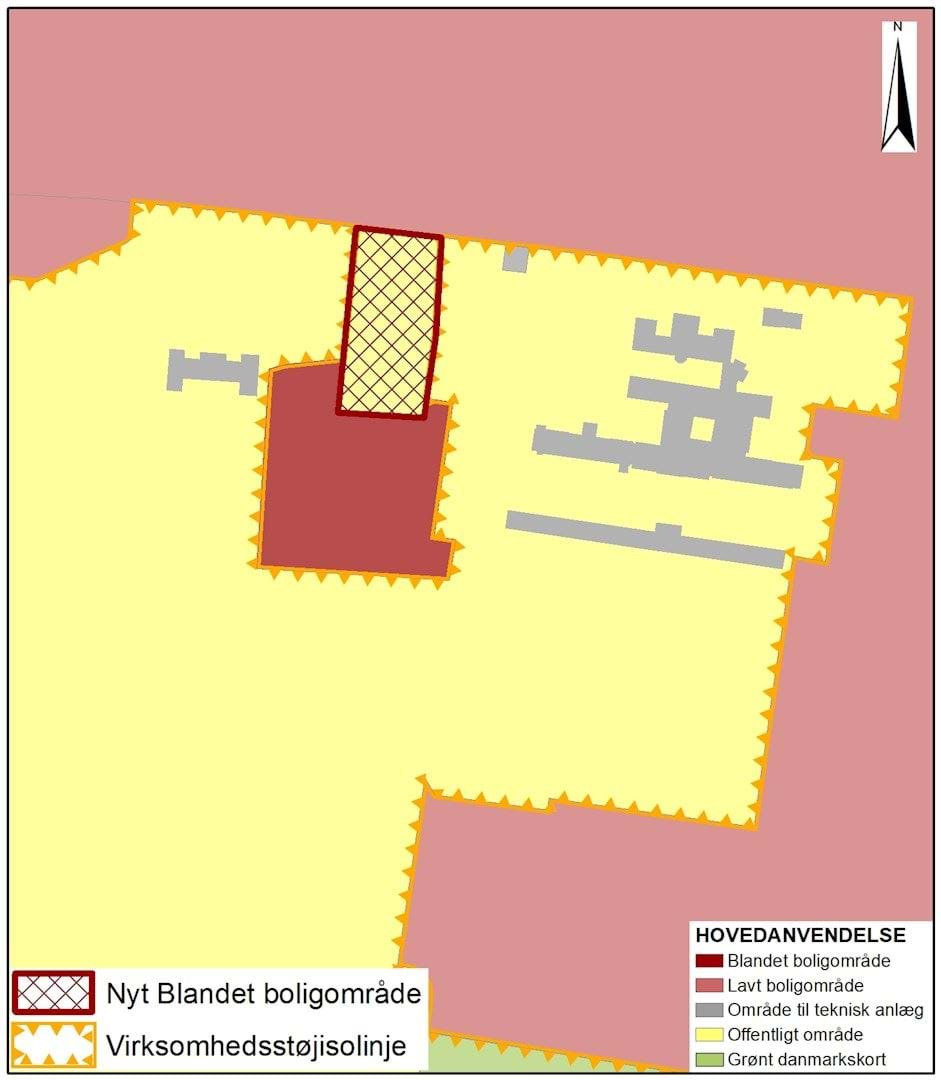På kommuneplanens farvede hovedstrukturkort ændres en del af Offentligt område til Blandet boligområde samt virksomhedsstøjisolinjen. Ændringerne er illustreret på kortet.