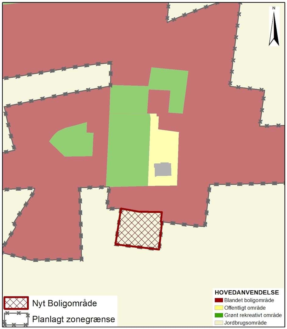 På kommuneplanens farvede hovedstrukturkort ændres en mindre del af et Jordbrugsområde til Blandet boligområde. I den forbindelse udvides også den planlagte zonegrænse. Ændringerne er illustreret på kortet.
