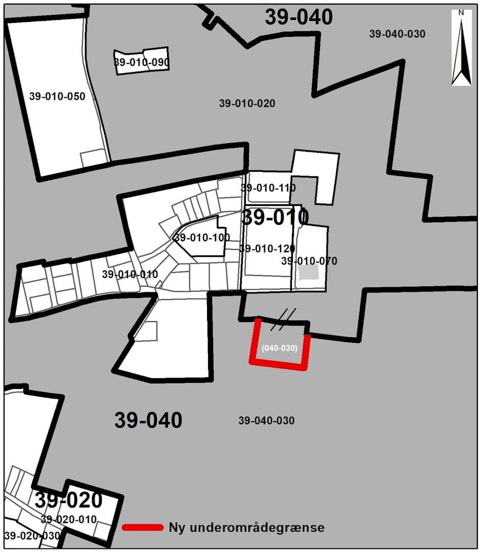 Af kortet kan ses at en mindre del af enkeltområde 39-040-030 udskilles og sammenlægges med enkeltområde 39-010-020, hvorved underområdegrænsen udvides.