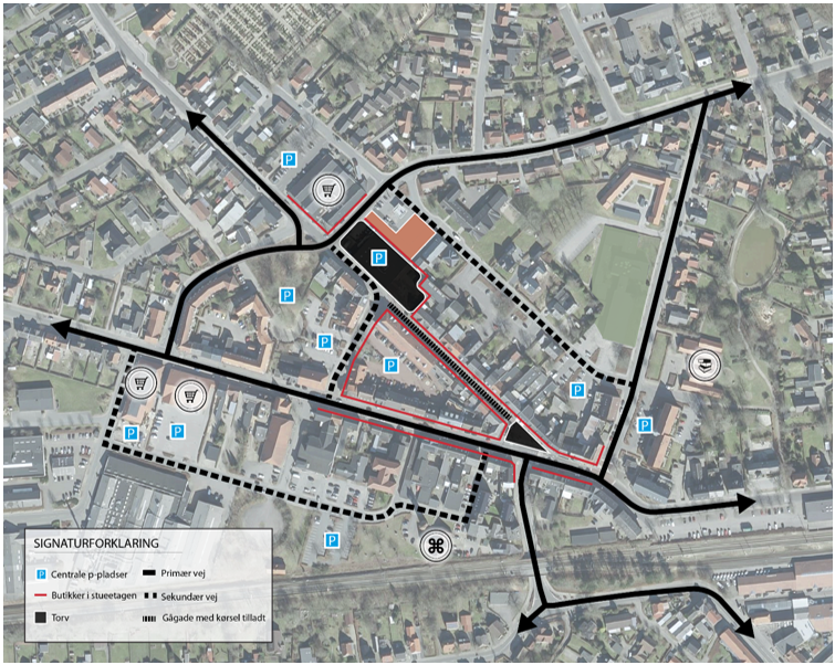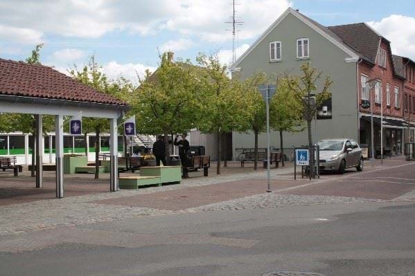 Den gamle brugsbygning foreslås erstattet af et stort centralt torv. Det vil komme til at ligge på det helt rigtige sted i bymidten, hvor trafikken fra Nordvestbyen vil ankomme via Gabelsvej, fra Nordøstbyen via Plantagevej, fra Tværsigvej og Nygårdsvej og fra Vestbyen via Møllegade. Trafik fra Sydbyen og Østbyen vil ankomme naturligt til centrum med Trianglen som indgang til handelsstrøget i Nørregade. Fra torvet vil det være let at gå videre til butikkerne i Nørregade til den ene side og til SuperBrugsen til den anden side. SuperBrugsen tiltrækker hver dag mange kunder, som med den nye parkeringsplads i højere grad kan få positiv effekt på handlen i Nørregade.