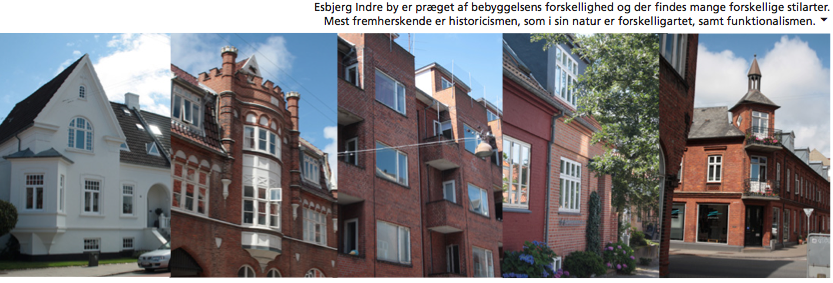 Hver enkelt bygning i Indre by er ofte sin egen og skiller sig lidt ud fra de omkringliggende. Bydelen bærer særligt præg af den hurtige udvikling byen gennemgik i slutningen af 1800-tallet og starten af 1900-tallet, hvor nye trends, iværksætteri og stigende indkomst afspejledes i arkitekturen. Der er derfor en fremherskende diversitet i stilarter, bygningsvolumen, facadelængde og farver igennem hele Indre by. Men den stamme styring af de overordnede linier, der fra starten har været i Esbjerg, gør at der i forskelligheden ofte opstår en særlig esbjergensisk sammenhæng og homogenitet. Her er kontraster reglen mere end undtagelsen, her står nyt og gammel side om side, men den grundlæggende takt i byplanen gør, at den indbyrdes forskellighed tolkes som en improvisation over sammen grundlæggende tema.