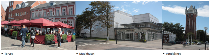 Særligt seks byrum skiller sig ud ved deres størrelse, bygningsværker og tilknytning i bystrukturen – Torvet, Musikhuspladsen, Vandtårnet og Byparken, Banegårdspladsen, Vor Frelsers Kirkes plads og HC Ørstedsparken og Indkøbscentret Broen. Den tidligere tobaksfabrik, der i dag er omdannet til spillestedet og kulturhuset "Tobakken" ligger fint i området med sin markante og karakteristiske industriarkitektur.