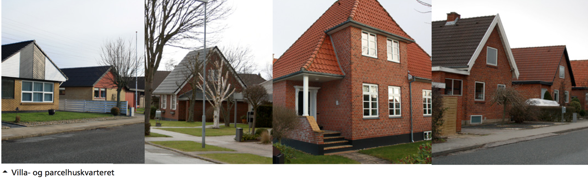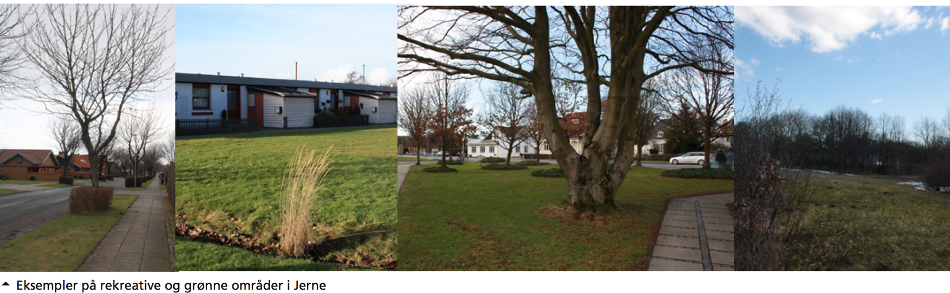 Villa- og parcelhuskvartererne fremstår grønne med private haver, allé træer og grønne rabatter mange steder. Dog er der ikke mange kvartersparker, opholdslommer eller legepladser i forbindelse hermed. Disse finder man dog i forbindelse med de større planlagte boligbyggerier.