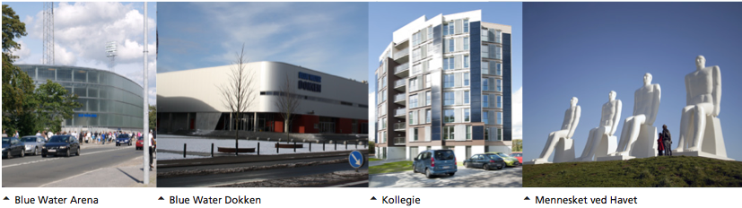Blue Water Arena er med sin højde og volumen et markant pejlemærke i området. Desuden danner kunstværket ’Mennesket ved Havet’, i folkemunde kaldet ’De fire hvide mænd’, et markant pejlemærke.