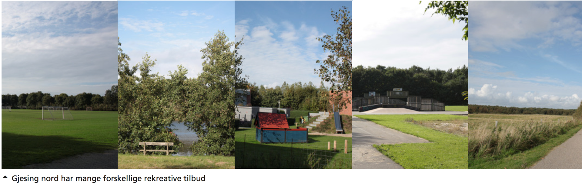 Området er omgivet af det store rekreative naturområde langs Fovrfeld bæk. Alle boliger i området har let adgang til et stort netværk af rekreative stier, opholdsarealer og legepladser. Desuden har hvert kvarter tilknyttet mindre fælles opholdsarealer. Hovedparten af boligerne i området har egen have eller terrasse i direkte tilknytning til boligen. Der er altså mange muligheder for rekreative aktiviteter i Gjesing nord.