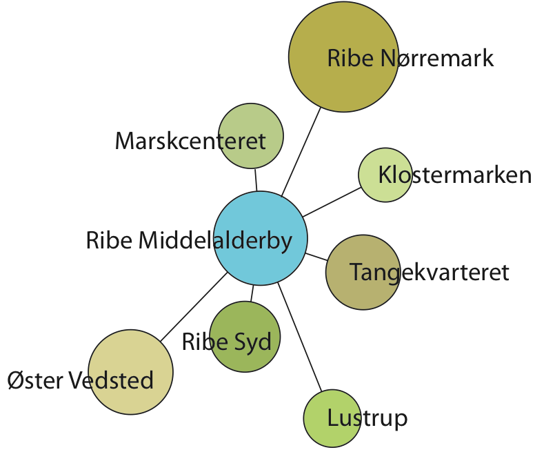 Ribes bebyggelse er placeret på bakkeøer i landskabet og hvert byområde er klart defineret i landskabet som følge deraf. De naturlige lavninger i landskabet danner samtidig grønne/blå kiler gennem byen og sikrer, at der er let adgang til naturen i alle byområder.
