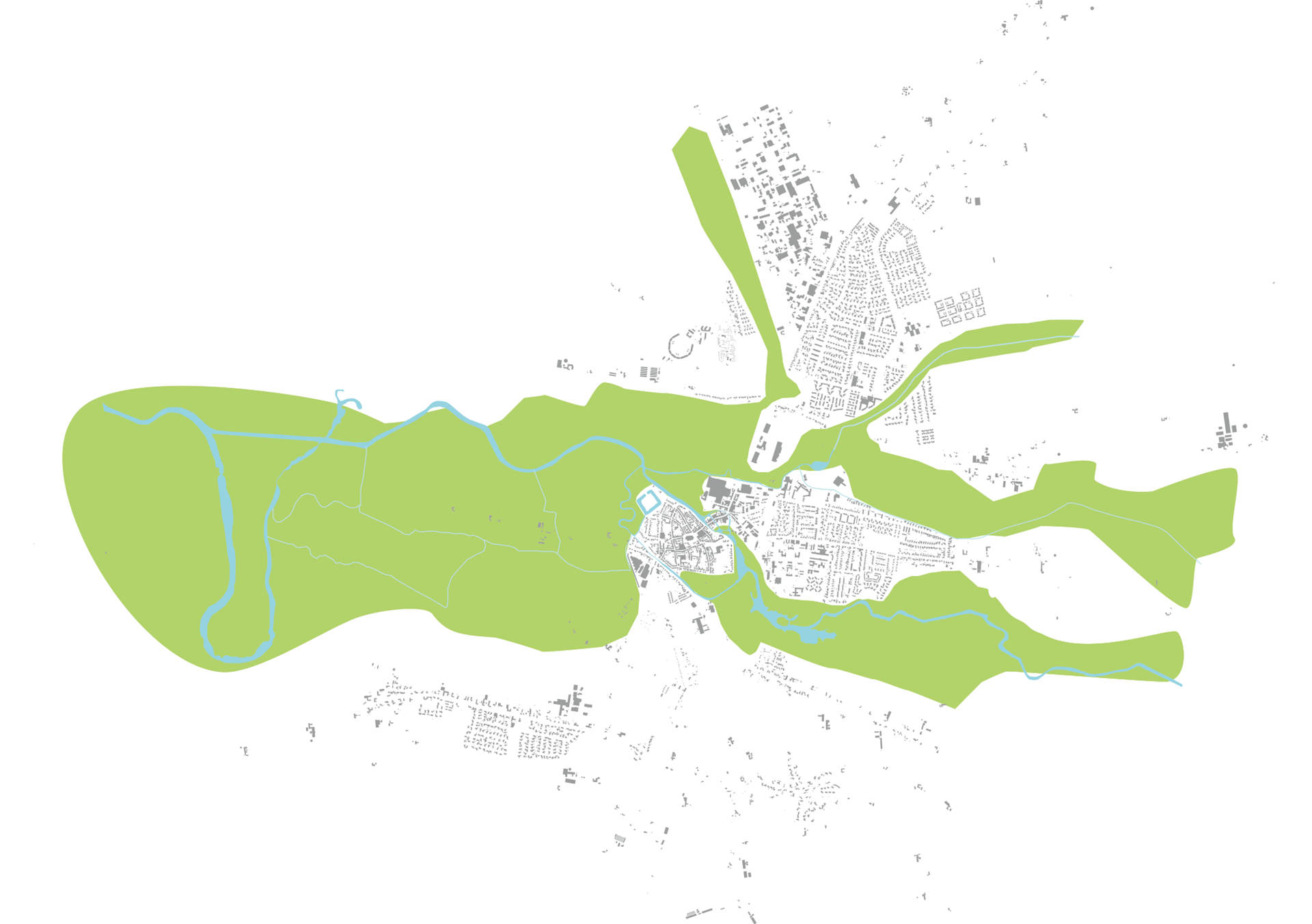 Åløbene gennem byen og det omkringliggende lave marsklandskab gør desuden området til noget helt specielt. Byens muligheder for at udvikle sig har historisk været begrænset af byens beliggenhed midt i den flade ådal med udbredte eng- og moseområder, og bykernen er derfor tæt bebygget. Principper om at bygge mindre afgrænsede enklaver er sidenhen ført videre i byens forskellige kvarterer, der hver i sær er klart afgrænset af landskabet.