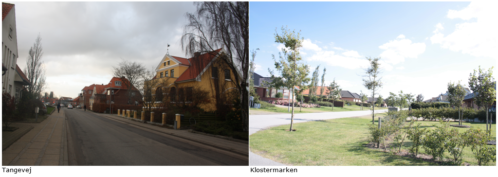 Tættest op mod bykernen bygger bebyggelsen på tidstypiske principper med en åben villaby der består af tidstypiske villaer, præget af jugendstil og bedre byggeskik. Herefter udvikler området sig med mere almindelige villaer og rækkehuse, herunder mange boligforeningsbyggerier.