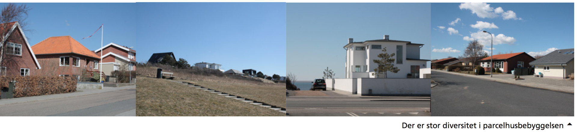 Parcelhusområdet har en stor diversitet i byggestil, men generelt finder man tættest på stranden flere muremestervillaer og arkitekttegnede huse, mens man i den østlige del af området overvejende finder typehuse. Længst mod nord i det der hedder Kystparken finder man en meget homogen bebyggelse bestående af typehuse fra 50’erne.